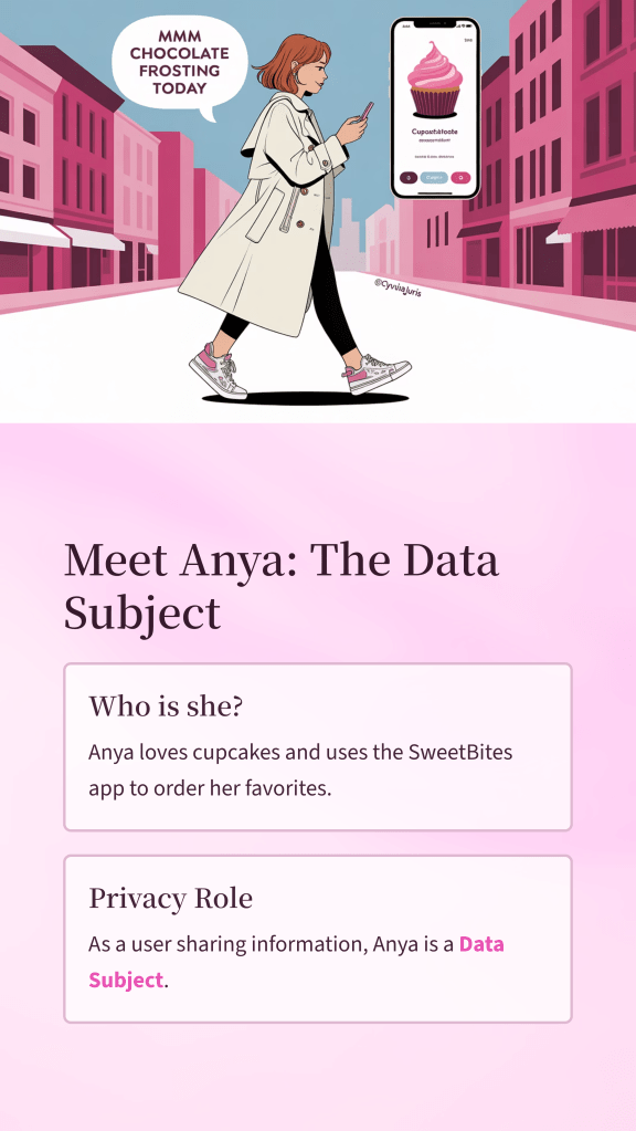 Anya loves cupcakes. When she uses the SweetBites app, she enters her name, address, and phone number. That makes her the Data Subject – the individual whose personal information is collected.