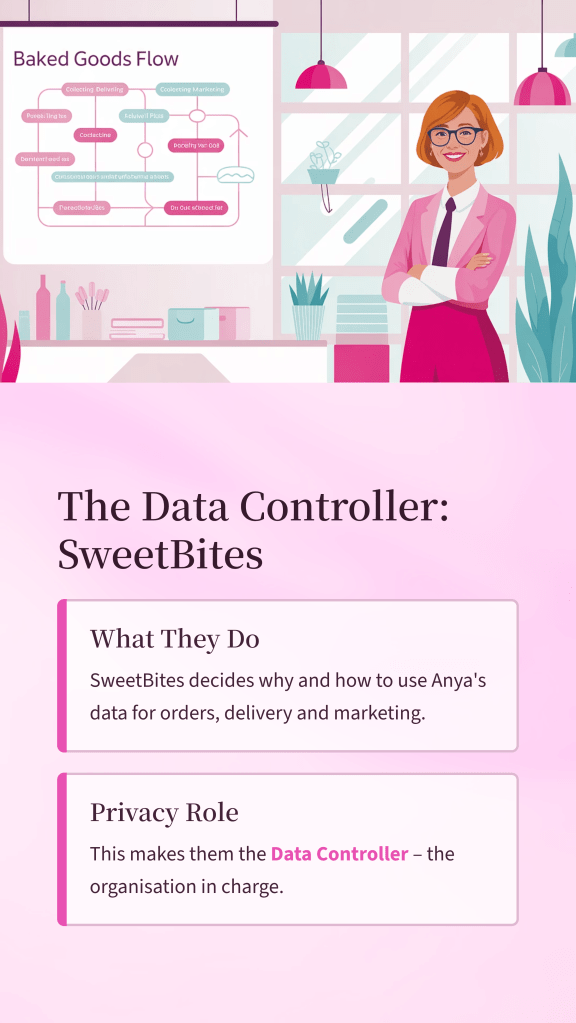 The bakery decides why and how to use Anya’s details – for delivery, billing, or marketing. That decision-making role makes SweetBites the Data Controller.