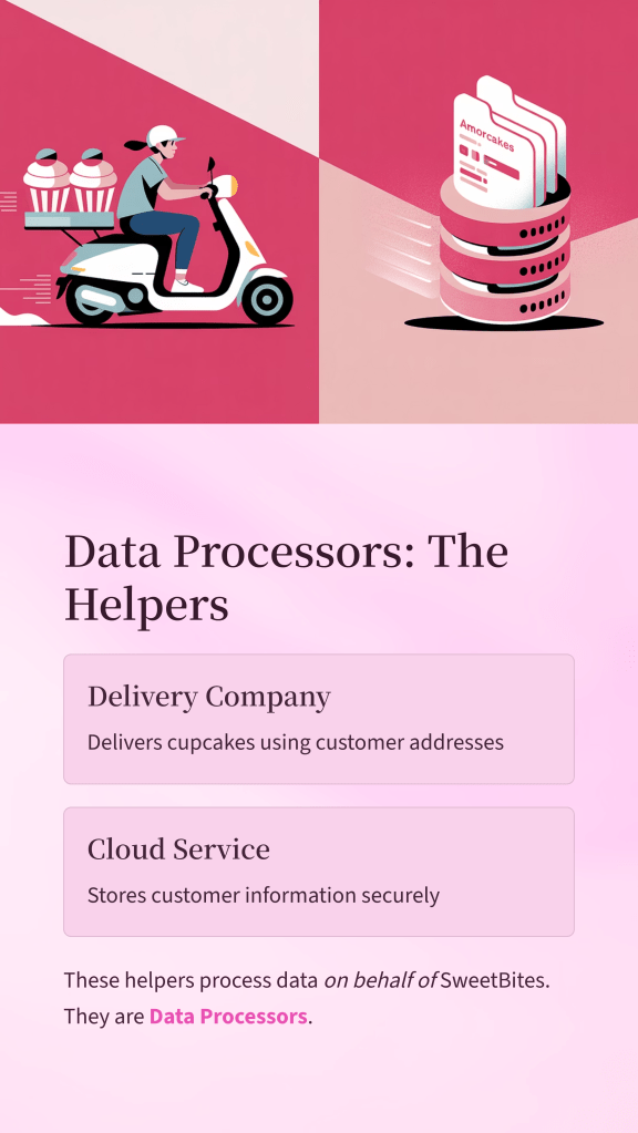 SweetBites doesn’t work alone. The delivery company and cloud server process Anya’s data on the bakery’s instructions. They are Data Processors.